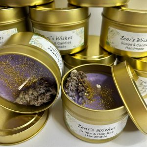 Vela en envase de lata color oro. Aroma de lavanda con un toque de lavanda natural seca. Apróximadamente 90ml.