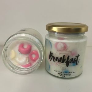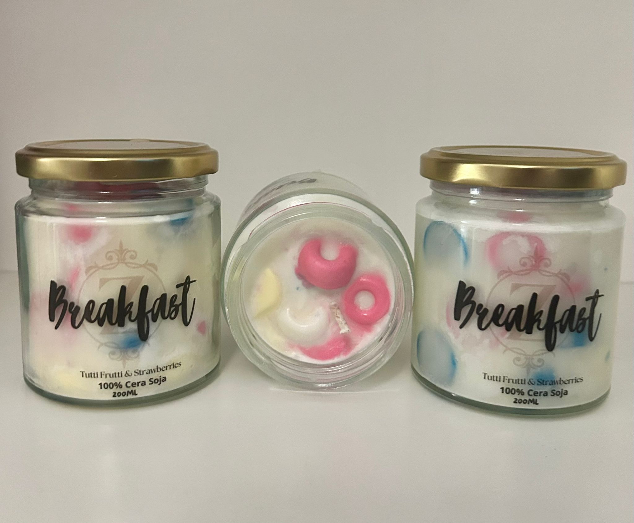 La vela Breakfast inspirada en un clásico desayuno con cereales contiene aroma a tutti frutti y fresas con nata.