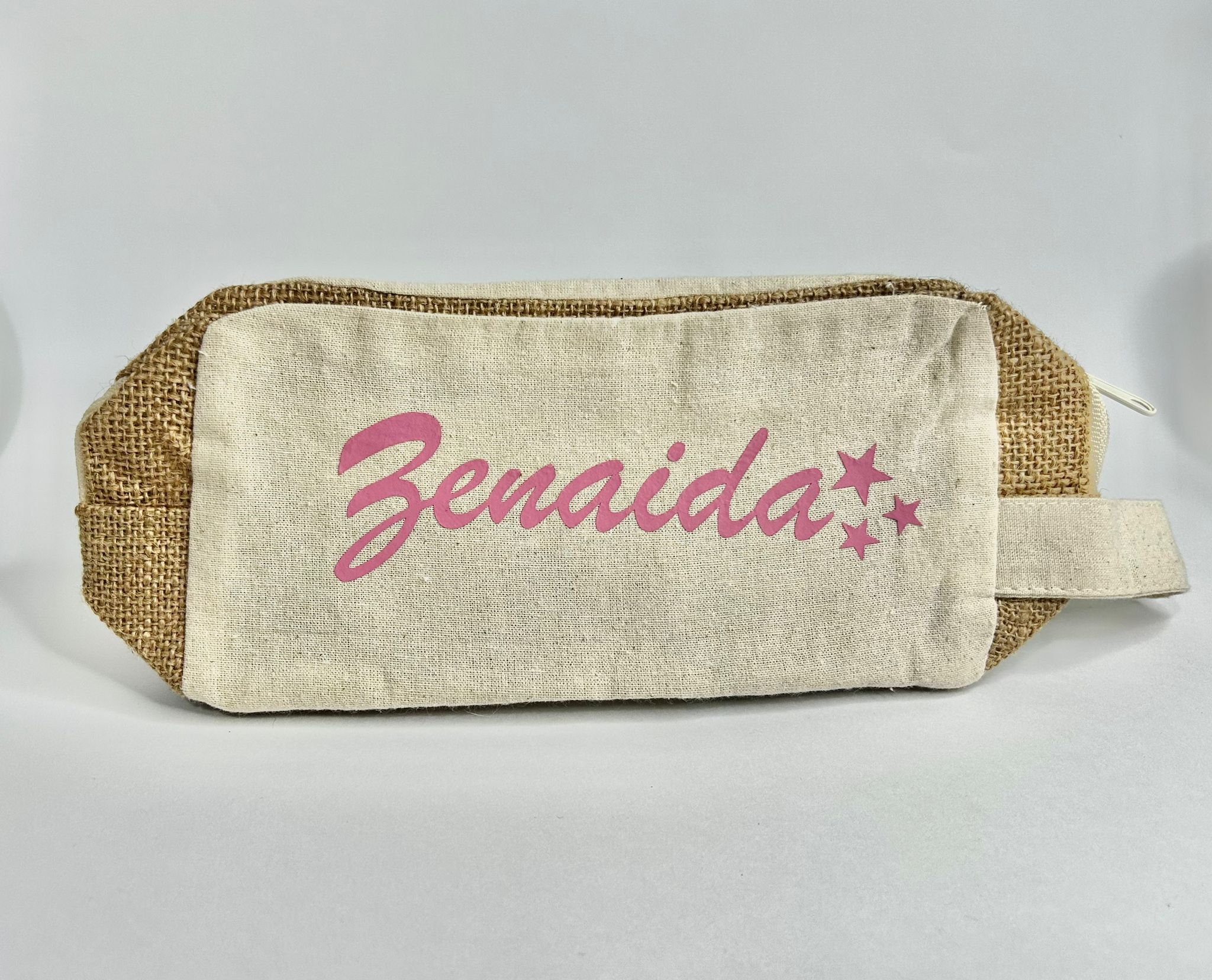 Neceser de algodón y yute. Personalízalo con tu nombre o tu inicial o ambas cosas. Escríbe en los comentarios del pedido lo que quieres que pongamos. Medidas 21.5x16x5cm.