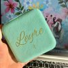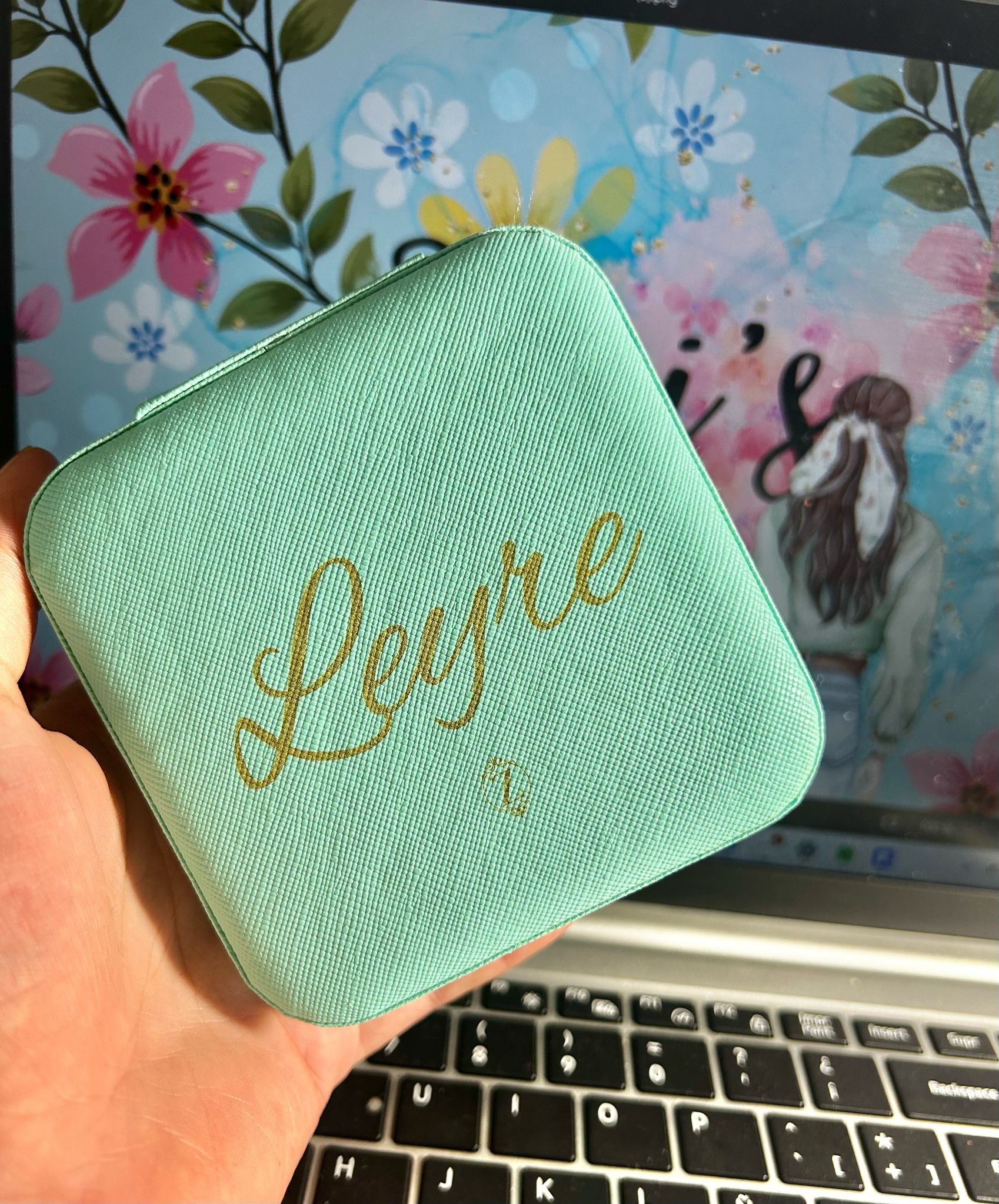 Graba tu nombre en este mini joyero. Piel sintética, color turquesa.