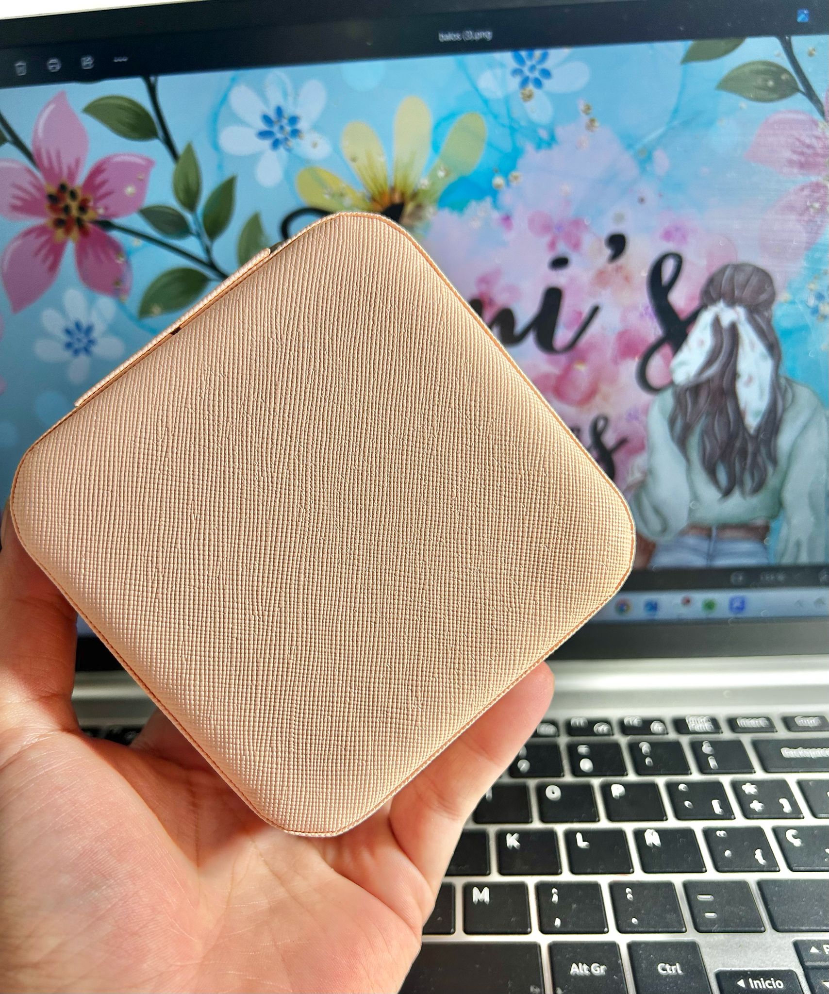 Mini Joyero grabado color rosa palo. Piel sintética.
