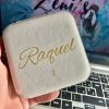 Añade tu nombre a este mini joyero ideal para llevar encima a cualquier parte. Escoge tu color y añade el nombre en los comentarios de tu pedido. Puedes añadir también si quieres un corazón, una mariposa, etc. Medidas 9x9cm.