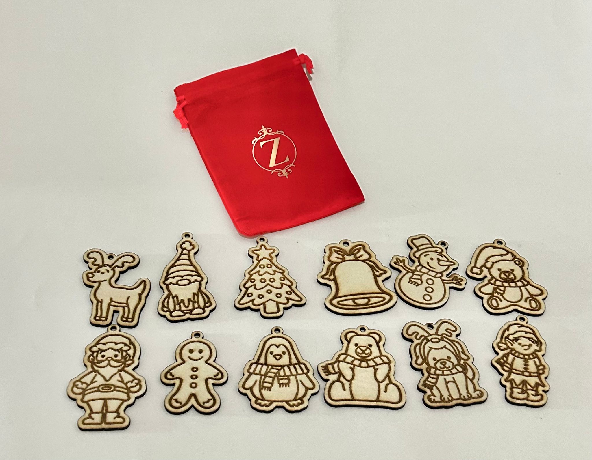 Set de 12 adornos presentados en bolsita de terciopelo para tu árbol de Navidad.